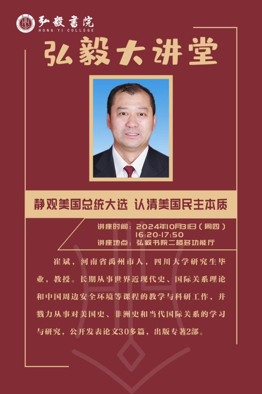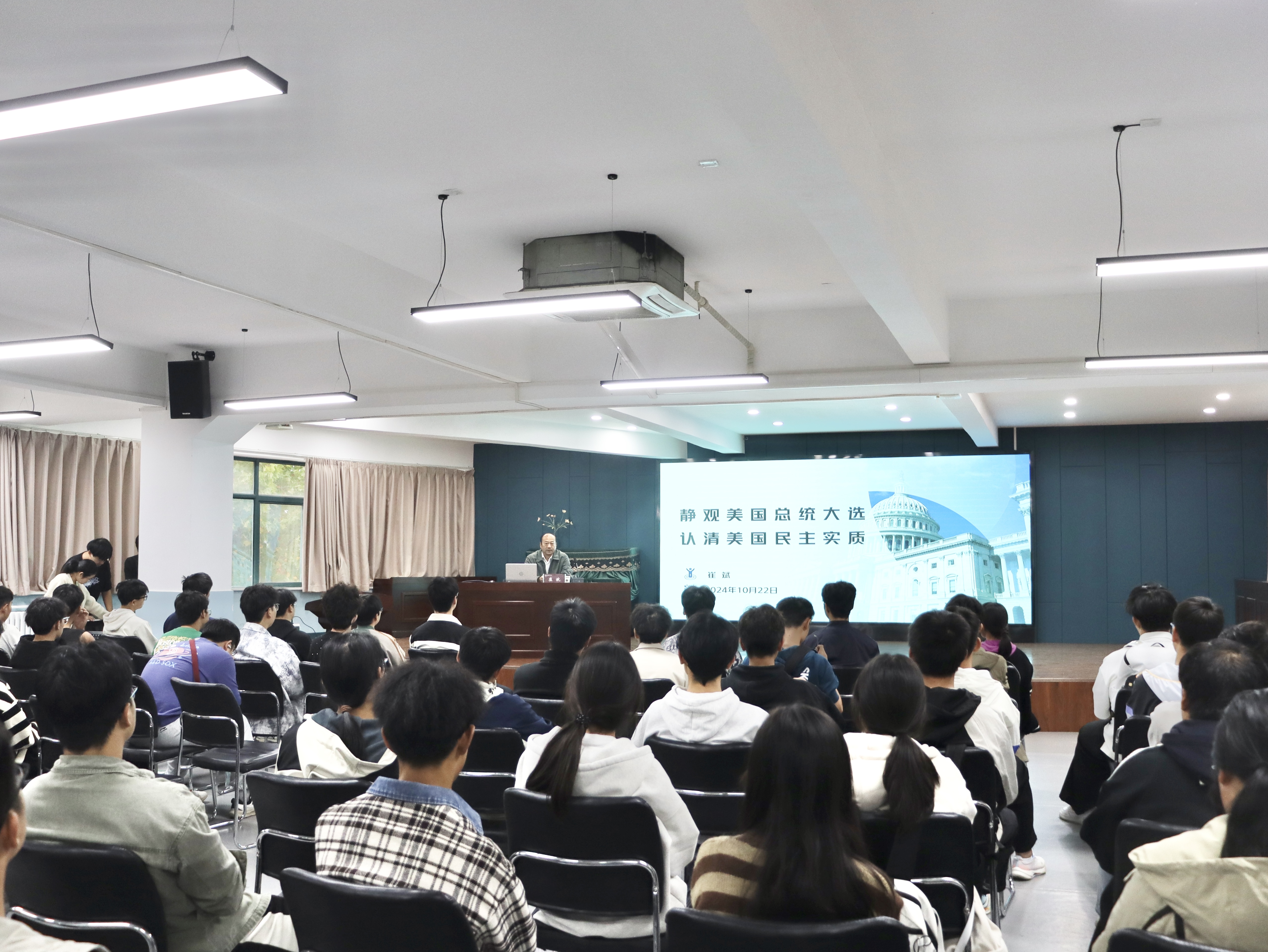 崔斌以《静观美国总统大选 认清美国民主本质》为题,从美国总统大选的宪法解释、美国总统大选史话、2024年美国总统大选旁观、认清美式民主的本质四个方面,引导师生通过认清美国民主本质,正确看待中美关系面临的机遇和挑战,使广大师生坚信,中国拥有足够的战略耐心和政策手段来应对外部压力,并使之成为强国建设和民族复兴的强大动力。