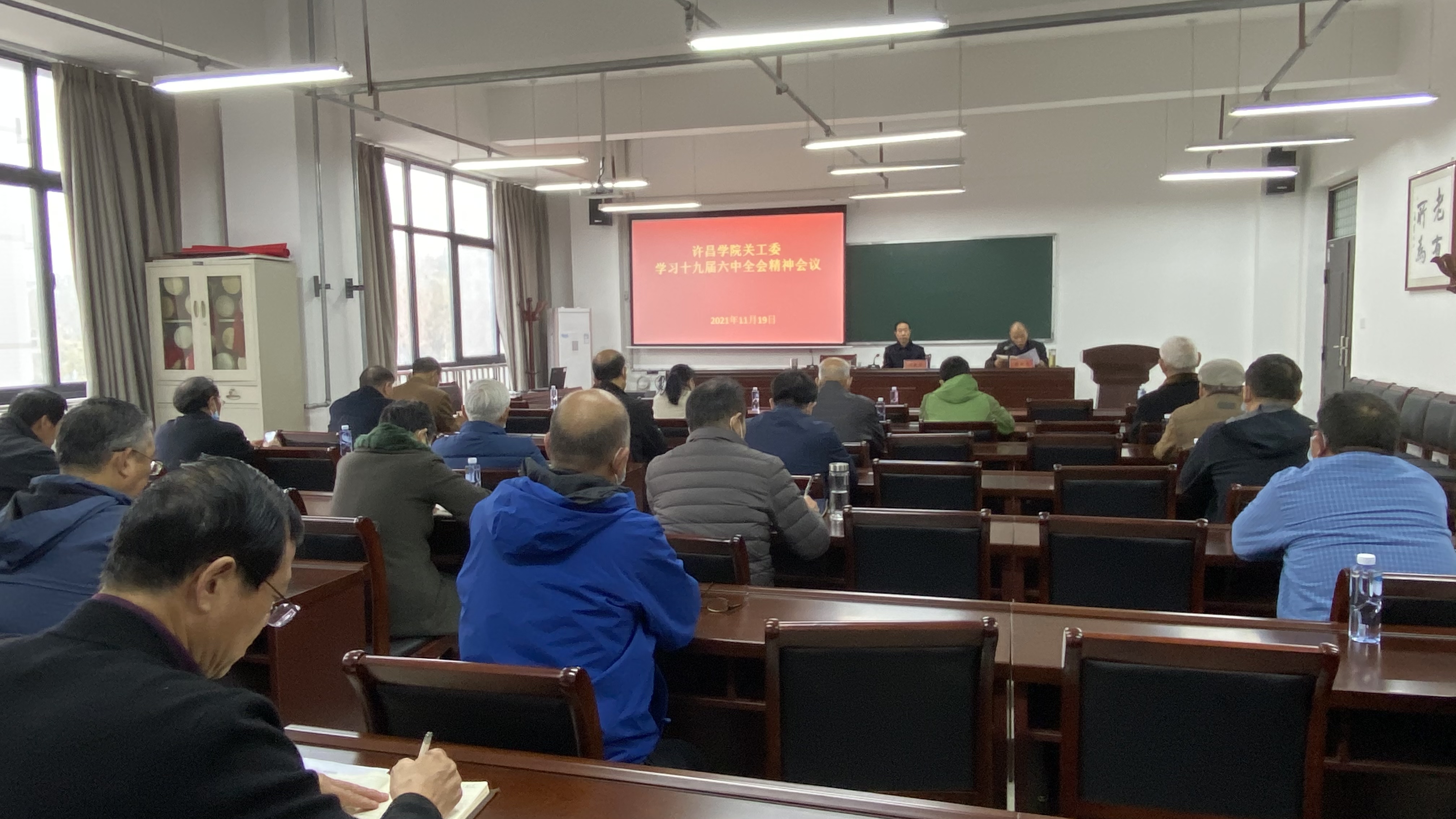 2021年11月19日,许昌学院关工委召开学习党的十九届六中全会精神会议。许昌学院关工委副主任汪庆华、黄桂贞,秘书长唐红亮,副秘书长刘国臣、涂白诚,二级学院关工委副主任,德育宣讲团、教学督导团、校园文明督导团成员和学生党建组织员参加会议。会议由唐红亮主持。会上,与会同志集体学习了党的十九届六中全会精神,汪庆华同志传达了教育部党组〔2021〕34号文件和省委高校工委、教育厅党组〔2021〕128号文件、学校党委〔2021〕91号文件精神,常务副主任黄桂贞就学习宣传贯彻党的十九届六中全会精神和做好当前工作提出要求。